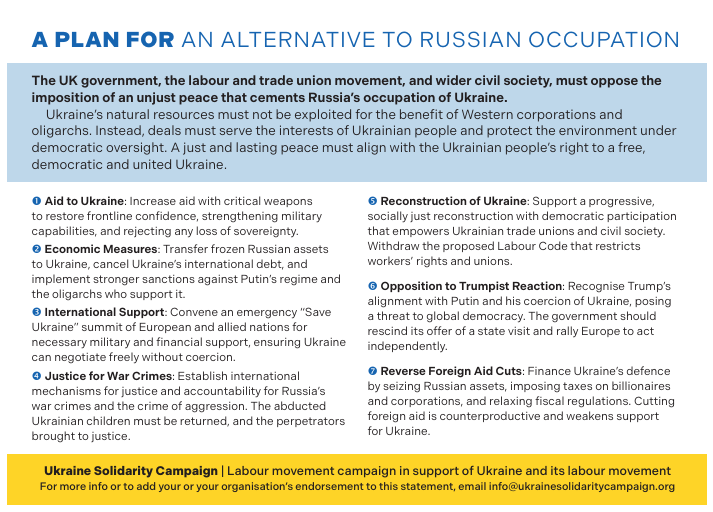 How can Labour help Ukraine win? Fringe Meeting at Labour Party Conference 2025 Labour Party conference fringe meeting in support of Ukraine and its labour movement, organised by Ukraine Solidarity Campaign. Open to all, no conference pass needed 6pm, Tuesday 30 September - The Liverpool pub, 14 James Street, Liverpool L2 7PQ Join us for … Continue reading Occupation is not Peace: Labour Party conference 2025 fringe meeting
