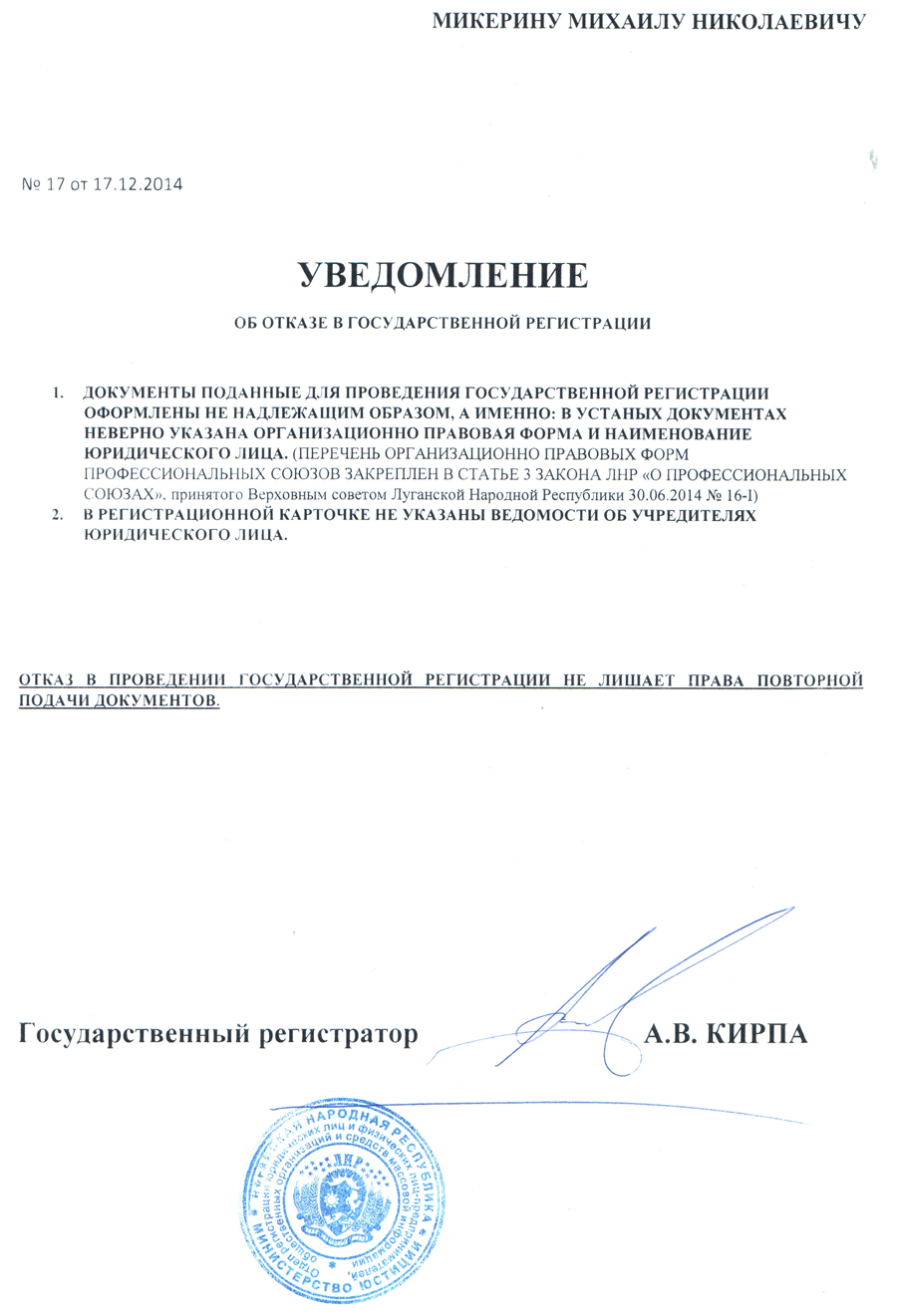 In accordance with the order of the Minister of Justice A. V. Shubin on 20.01.2015 No.8-OD “On the banning of the registration of independent trade unions on the territory of the Luhansk People’s Republic’, and also in accordance with paragraphs 1 and 2 of article 25 of the law of the Luhansk People’s Republic “On the state registration of legal persons and natural persons”, the decision was taken by the state registrar to refuse the state registration of the legal person.