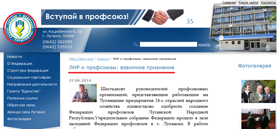 The Federation of Trade Unions of the “DNR” (Donetsk People’s Republic) http://www.osps.dn.ua/was formed this weekend amidst all the pomp and circumstance reminiscent of the era of stagnation (the Brezhnev years – MB). Of course, at the core of this rotten formation are the bureaucrats of the Federation of Trade Unions of Ukraine (FPU). Loyal to the Ukrainian oligarchs the FPU has agreed to be their instrument of control over the workers in the territories seized by the separatists. So now we can stop thinking about the development of an independent trade union movement in these “people’s” republics. The Independent Miners Union at the Barakov mine has already come up against the force of the Instruction “about the prohibition of registration of independent unions” (http://npg.social/title/275/).