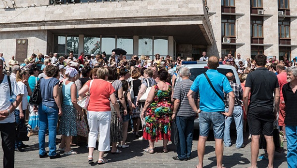 On 15th June 500 residents of the Oktyabrskoe district of Donetsk took part in a stop the war protest. The anti-war protesters demanded that the Russian forces should stop shelling and using civilian buildings as cover. shouting: “Stop the war!”, “Give us back our houses, our homes are broken!”, “Get out of here!”