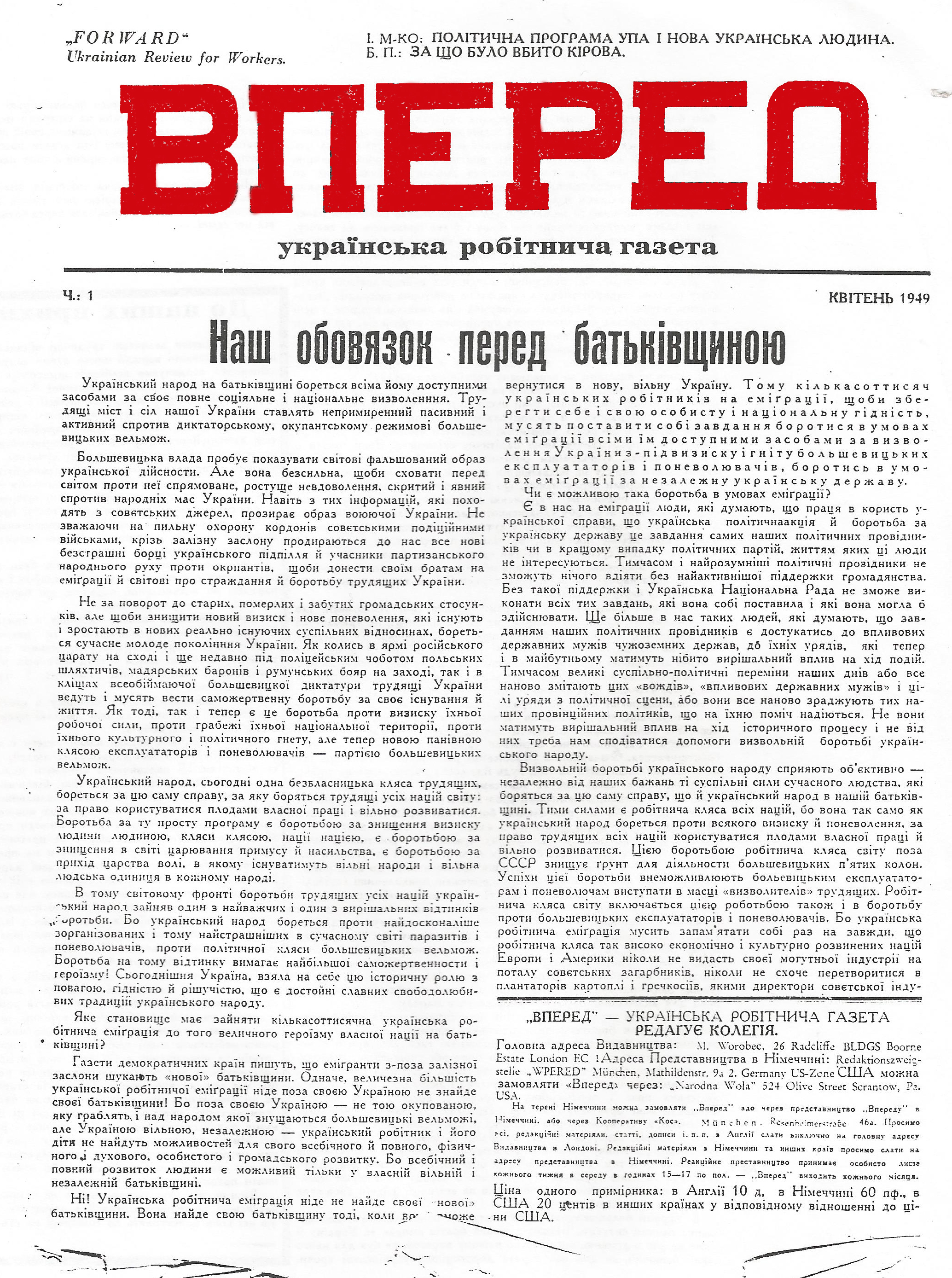 Published here is an appeal directed to Ukrainian émigré workers to join trade unions and participate in our labour movement. It was published by Vpered a Ukrainian workers paper published by the emigre Ukrainian Revolutionary-Democratic Party, formed by socialist refugees in Europe who survived Stalin and Hitler. The first article is by Omelian Volynets on Why I Joined the Transport and General Workers Union, (now UNITE the union), the second is an Appeal by British Trade Unions to Ukrainian Workers.