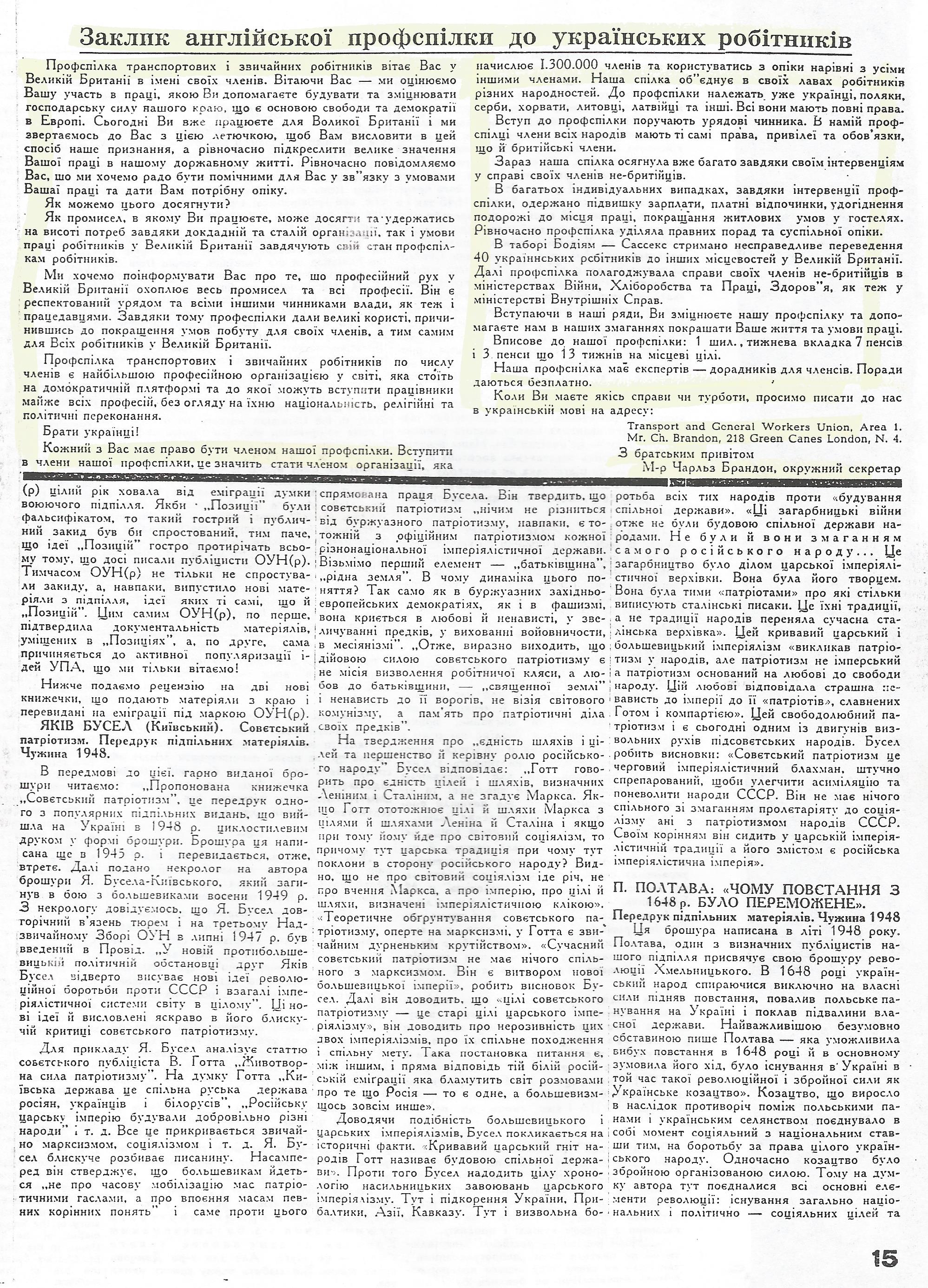 Я сподіваюся, що справа членства в Профспілці транспортових і звичайних робітників стане амбіцією свідомого українського робітника. На мою думку, щоб не розпорошуватись, всі наші робітники мусять бути скупчені саме в цій єдиній професійній організації, яка від початку вела акцію в інтересах іноземних робітників та яка стоїть під впливом щирих демократів, як брати Брандон, Р. Мелліш, сестра МекКей і інші, та на чолі з ідейним провідником профспілки, знаним кожному українському робітникові, міністром закордонних справ Ернестом Беніном. Організовані українські члени профспілки хай передадуть клич від організації до організації: всі об’єднуймось в Профспілці транспортових та звичайних робітників. Коли це наші робітники усвідомлять, то не буде місця такому парадоксу, як National Agricultural Workers Union, яка перебуває під комуністичним управлінням і багато українських робітників є її членами. Ця прокомуністична профспілка на своєму останньому конгресі ухвалила резолюцію проти тих же своїх членів — іноземних робітників, щоб їх звільнити з роботи в сільському господарстві та вислати з Англії до країн їхнього походження. Резолюцію було передано урядові, який знав, що с/г робітники Англії потрібні та що резолюція має характер політичної демонстрації. Профспілка транспортових і звичайних робітників особисто через своїх лідерів склала уряду заяву про потребу затримання в сільському господарстві іноземних робітників, в тому числі українців.
