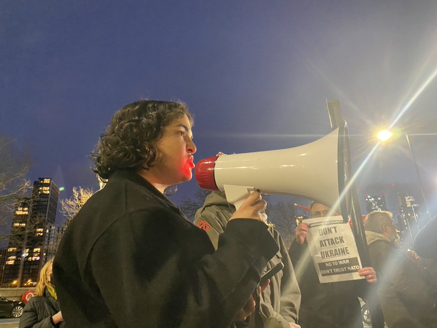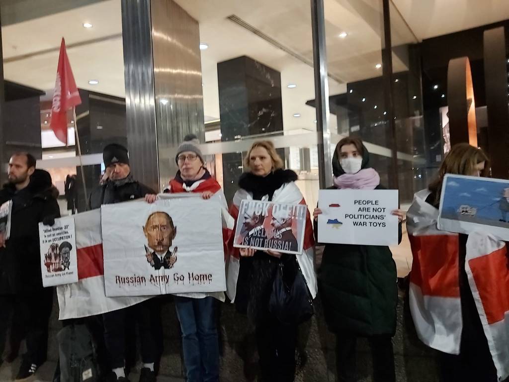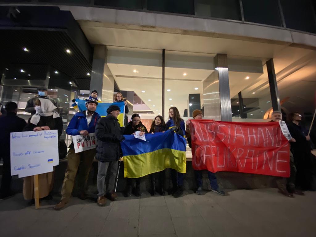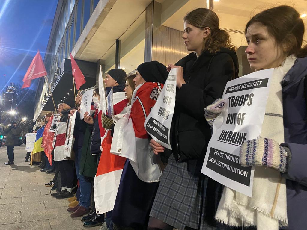 A solidarity protest calling for Hands Off Ukraine took place outside the studios of the Kremlin propaganda station Russia Today on Monday 31 January, with around 100 people attending.