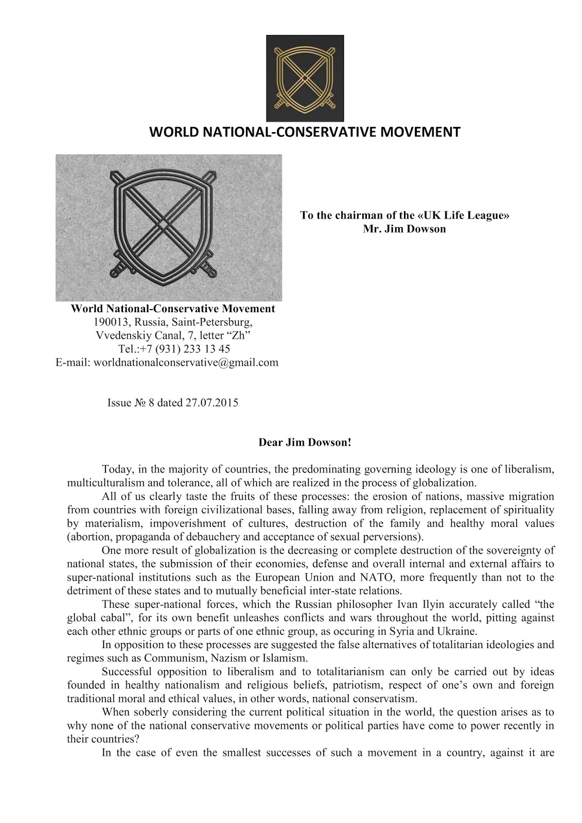 The manifesto of the movement claims that the world is governed by the ideology of “liberalism, multiculturalism and tolerance”. This, in the view of the activists, results in “the erosion of nations, massive migration from countries with foreign civilizational bases, falling away from religion, replacement of spirituality by materialism, impoverishment of cultures, destruction of the family and healthy moral values” through “abortion, propaganda of debauchery and acceptance of sexual perversions”. Furthermore, the manifesto refers to the “super-national institutions” such as the EU and NATO, and argues that these forces represent “the global cabal” which, in the Russian cultural discourse, is essentially a euphemistic reference to the global Jewish conspiracy. The WNCM aims to counter liberalism and globalisation by staging a “conservative revolution” and bringing far right parties to power in Western societies. The manifesto claims that a “victory of the conservative revolution even in one country […] will provide an example for other countries”. Establishing the WNCM is considered the first step in this direction.