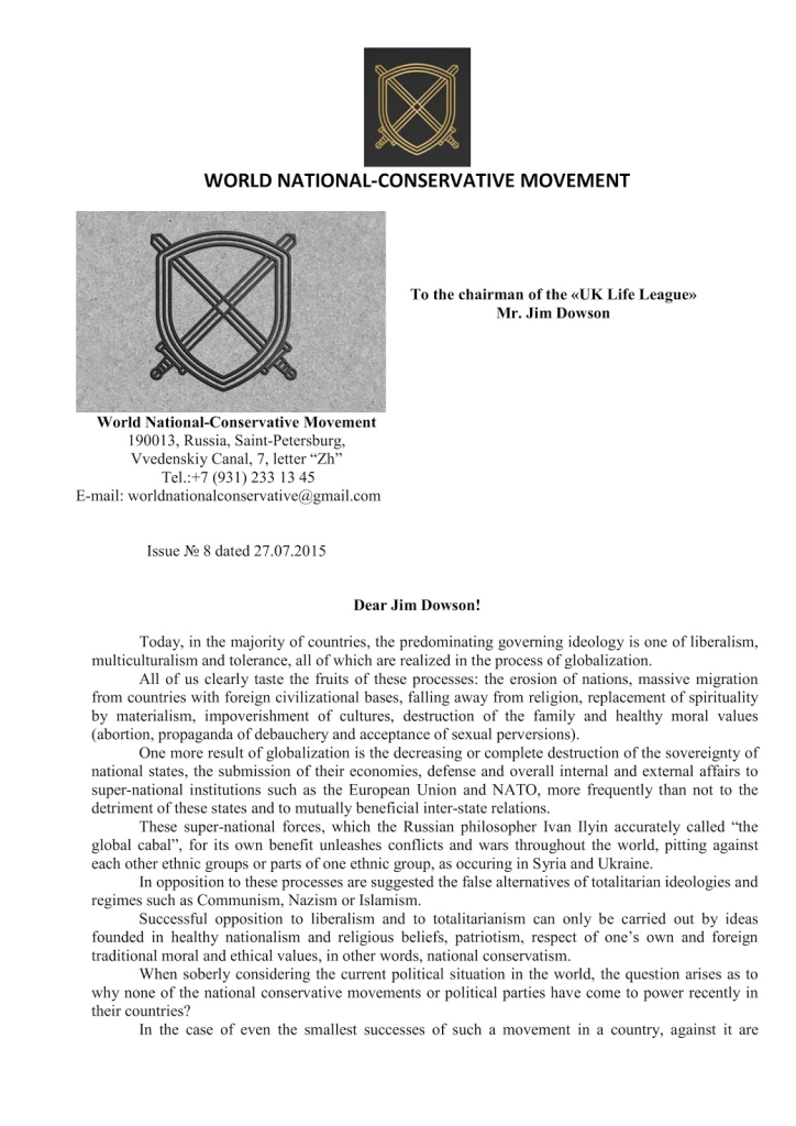 Russia seems to be getting serious about building an international alliance of extreme right parties that would aim at undermining the liberal democratic consensus in the West. In addition to providing financial support for parties such as France’s Front National and using extreme right activists and politicians as tools of propaganda, Russia is now building what it calls the “World National-Conservative Movement” (WNCM). A number of the internal documents (passed to me by the Moscow-based “Sova Centre“) provide an insight into the agenda and structure of the WNCM.