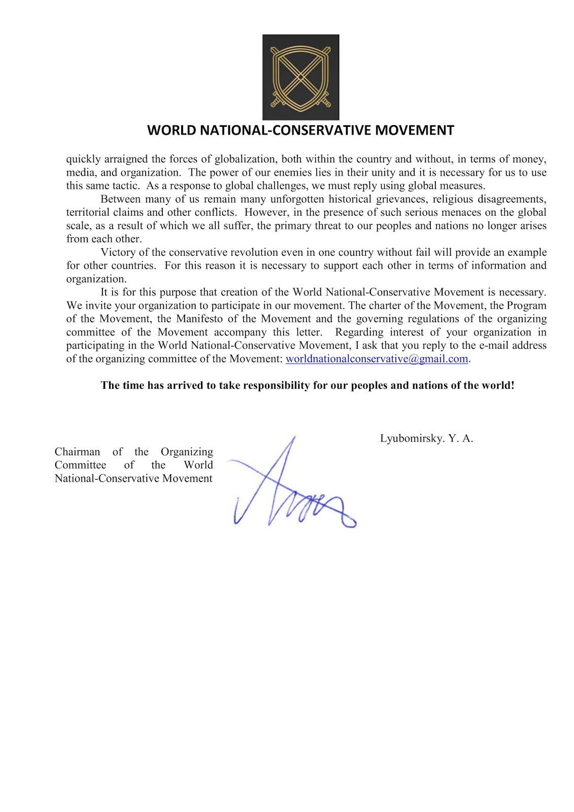The chair of the organising committee of the WNCM is a prominent member of Rodina Yuriy Lyubomirskiy. The phrase “national-conservative” in the title of the movement should not confuse the readers. “National-conservatism”, while being a legitimate term in political science, is only a misleading self-description of the WNCM to avoid the term “extreme right”.