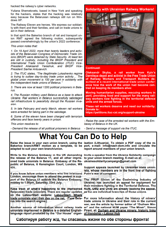 The July 2022 Annual General Meeting of UK rail and transport union RMT – currently engaged in national strike action to defend wages, jobs and conditions on the railways – passed the following in solidarity with rail workers in Belarus, jailed for taking action in solidarity with Ukraine. The Ukraine Solidarity Campaign (Scotland) issued a leaflet also distributed at the Durham Miners Gala.