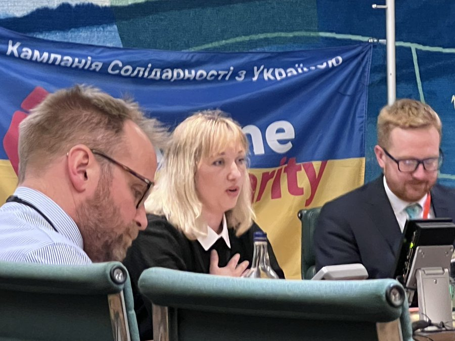 Oksana Holota of Confederation of Free Trade Unions of Ukraine – thanked the UK for weapons donated, and appealed to the Labour Movement that their members at front are calling for more off-road vehicles and direct aid.