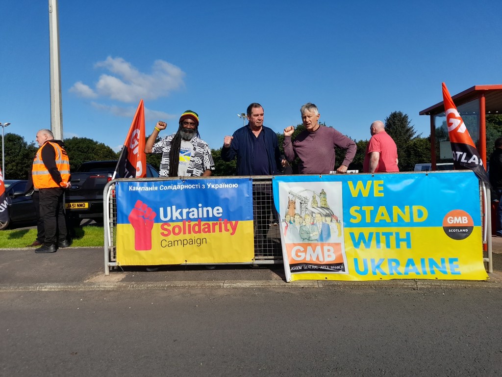 The Ukraine Solidarity Campaign Scotland joined GMB union members in a show of solidarity it their strike at the Defence Equipment and Support) depot in Beith this week.