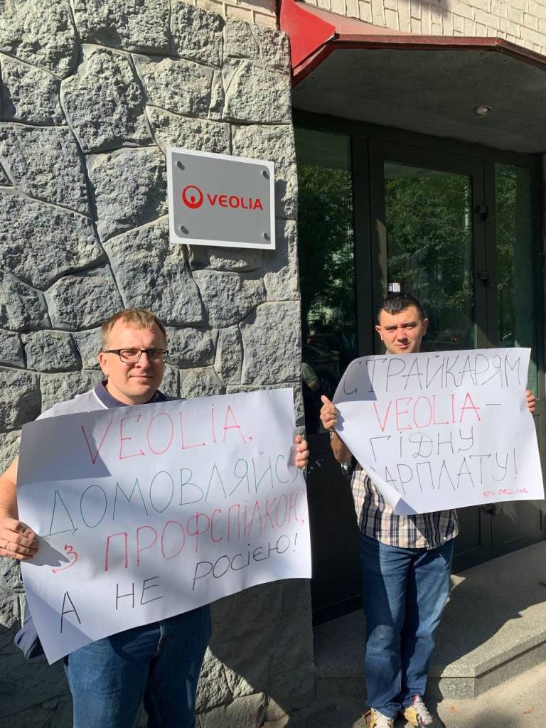 Despite wartime conditions activists of Sotcialny Rukh (Social Movement) in Ukraine protested at the HQ of Veolia in Kyiv also.