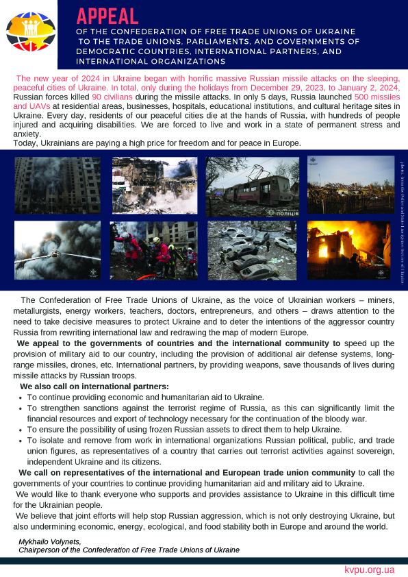 We call on representatives of the international and European trade union community to call the governments of your countries to continue providing humanitarian aid and military aid to Ukraine.