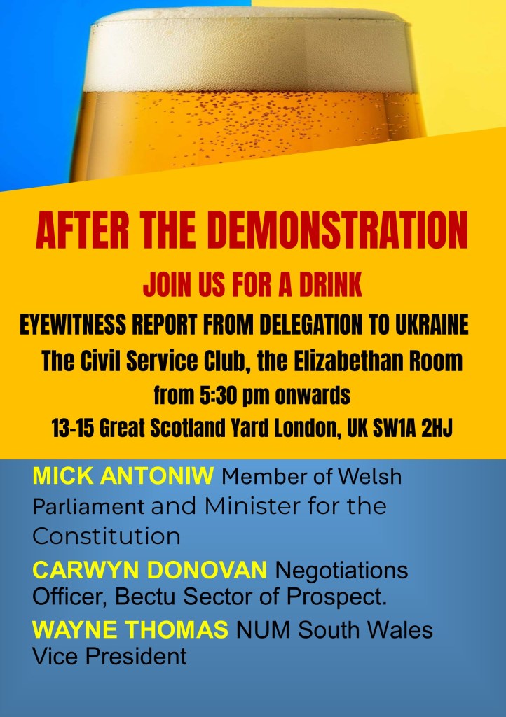 The Ukraine Solidarity Campaign is calling for a mass show of solidarity with Ukraine on the anniversary of the all-out Russian Invasion on 24 February. We are supporting a demonstration called by Support Ukraine/London EuroMaidan, and which is also supported by the Confederation of Free Trade Unions of Ukraine and Federation of Trade Unions of Ukraine. Bring trade union banners and join our Labour Movement Bloc. After the march join us at the Civil Service Club for a social event and eyewitness report back from delegation to Ukraine. Details below.