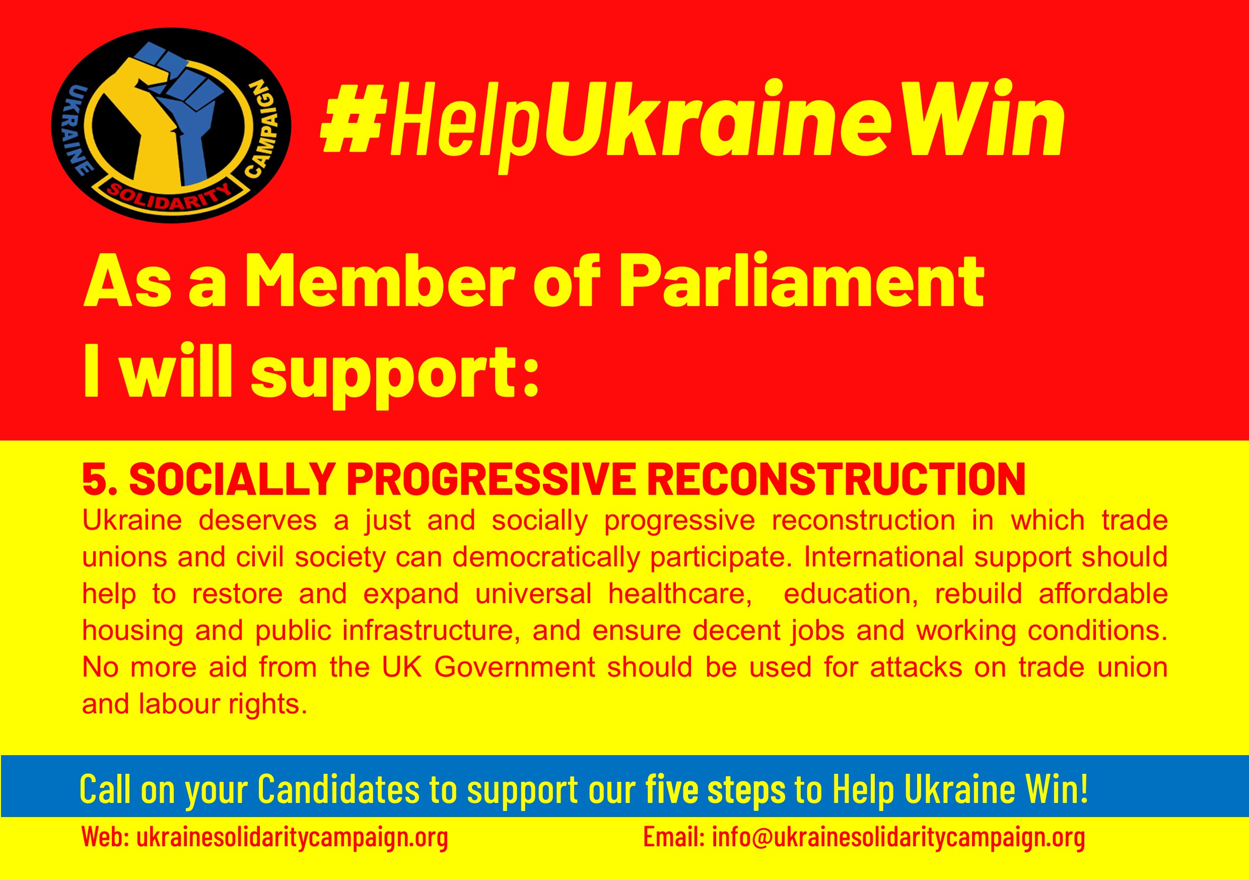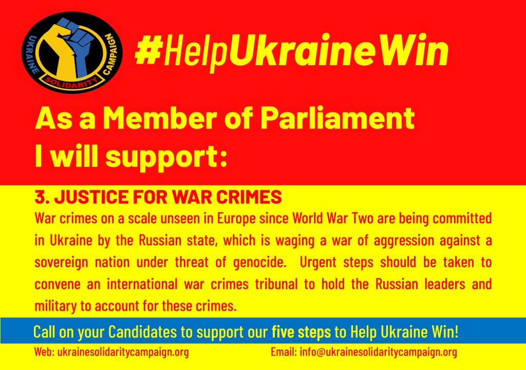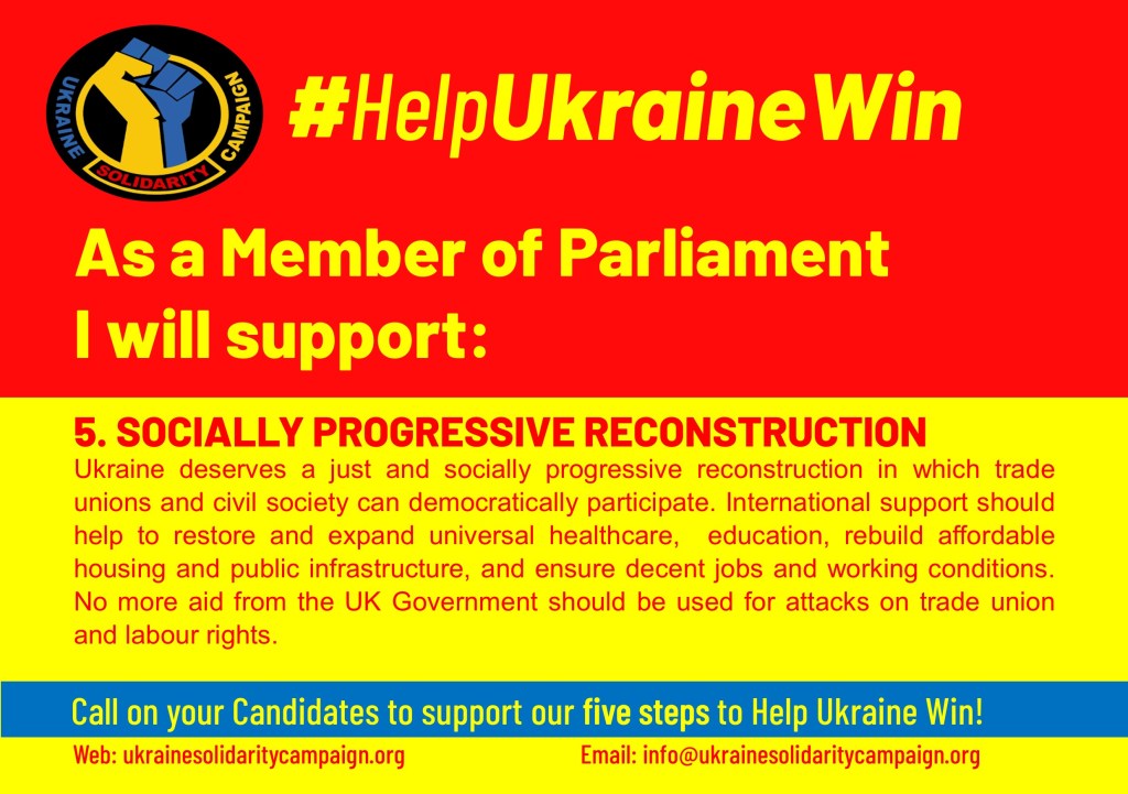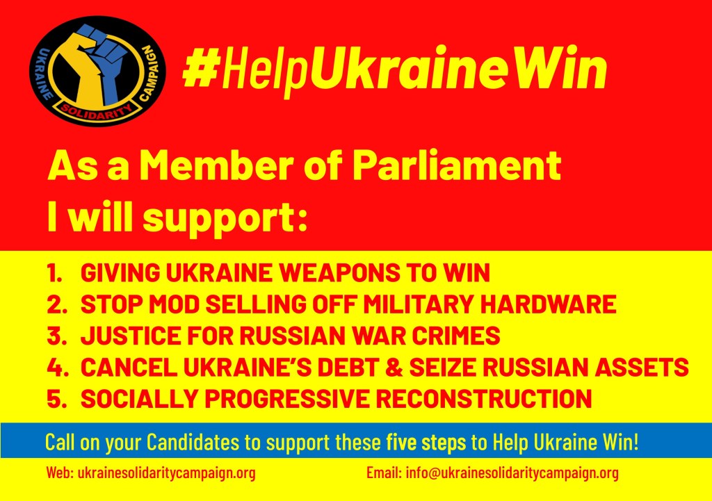 The outcome of the General election is an opportunity for change, the Ukraine Solidarity Campaign is writing to you as a Parliamentary Candidate to support five steps that a future government can take can to help Ukraine win and secure a just peace. We are asking candidates to sign up to support the following: