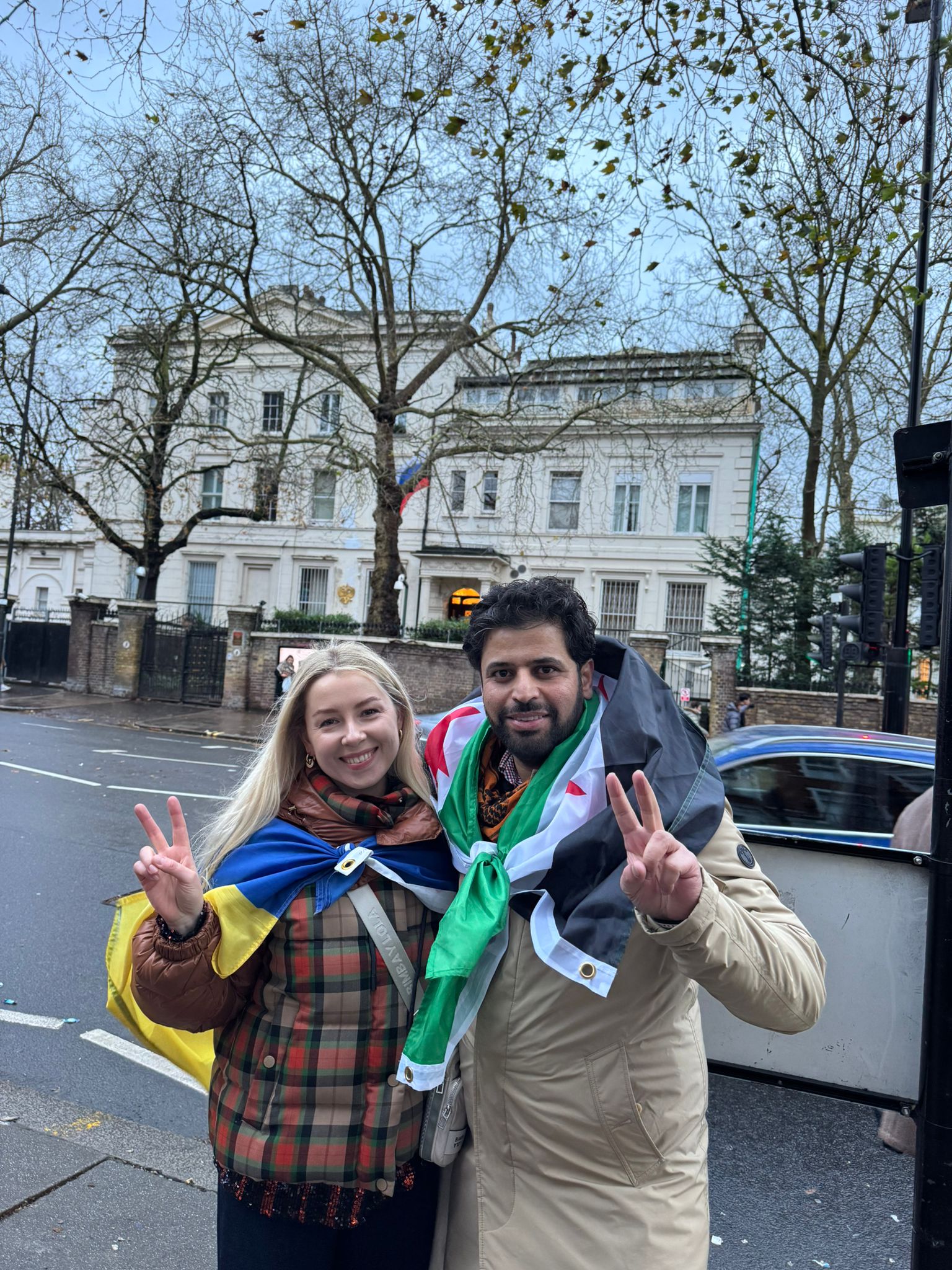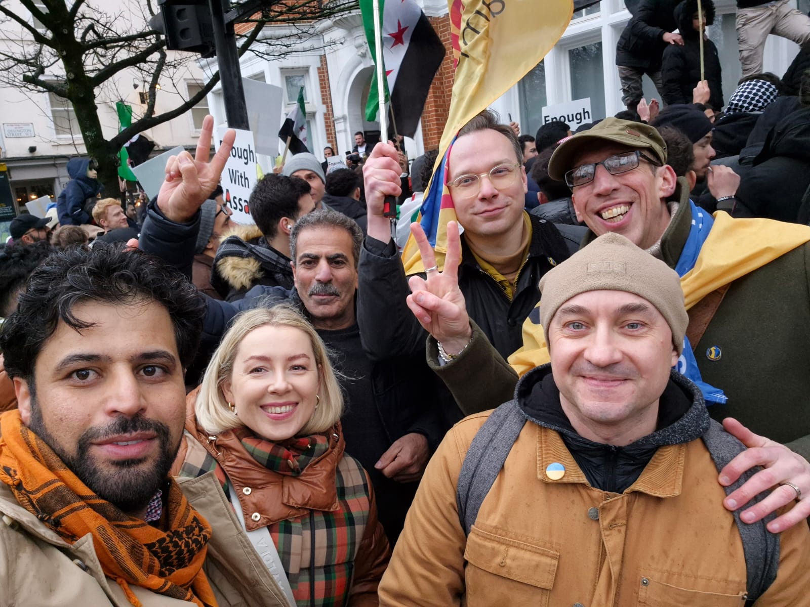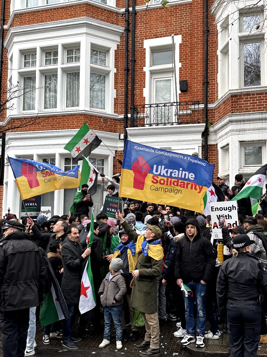 Supporters of the Ukraine Solidarity Campaign and Campaign for Ukraine joined with our friends of the Syria Solidarity Campaign on 7 December 2024 to protest Russian Bombing of Syria and show solidarity with the rapidly advancing Syrian Revolution which today toppled the tyrant, former president Bashar al-Assad who is now in Moscow.