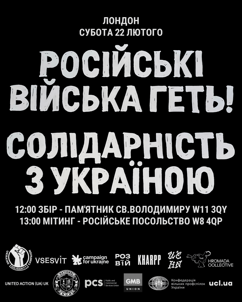 On Saturday 22 February 2025, just before the third anniversary of the full-scale invasion, a coalition of Ukrainian community and UK labour movement organisations will be marching to the Russian embassy in London for a protest and rally in support of Ukraine.