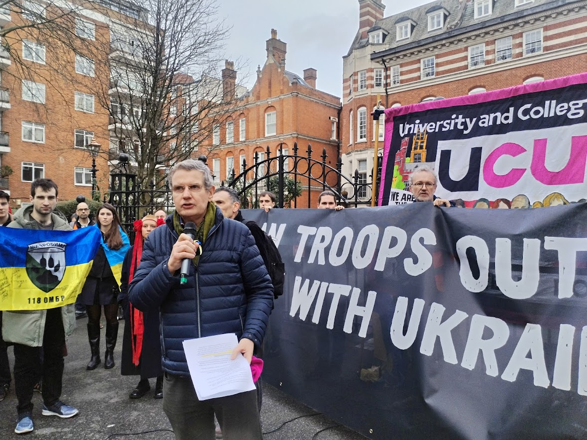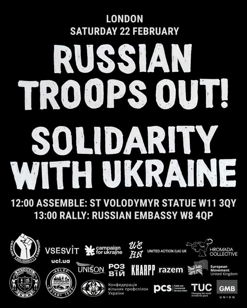 Thousands joined the solidarity protest in London on Saturday 22 February, organised by a coalition of UK labour movement and progressive Ukrainian organisations (including USC) under the slogans “Russian troops out – Solidarity with Ukraine”.