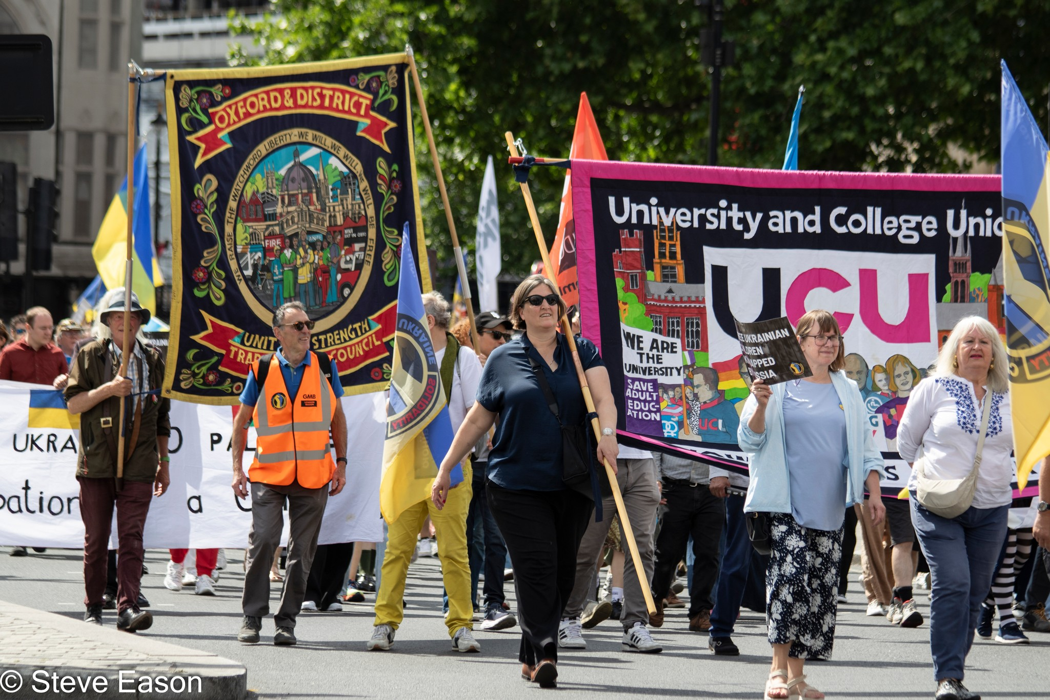 The protest saw strong support from the labour movement, with significant participation from unions including UCU, PCS, GMB, NUM, and ASLEF.