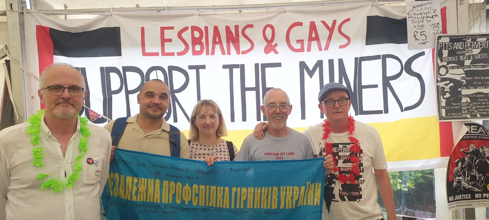 Image above: Ukrainian trade unionists Pavlo Holota and Oksana Holota at the Gala in 2023, with founding members of Lesbians and Gays Support the Miners. More of our photos from the 2023 Gala here (and a few from 2024 – we got seriously rained off!)