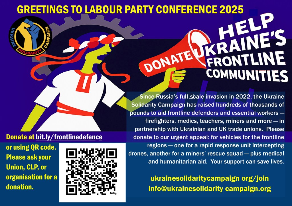 Labour Party conference fringe meeting in support of Ukraine and its labour movement, organised by Ukraine Solidarity Campaign. Open to all, no conference pass needed