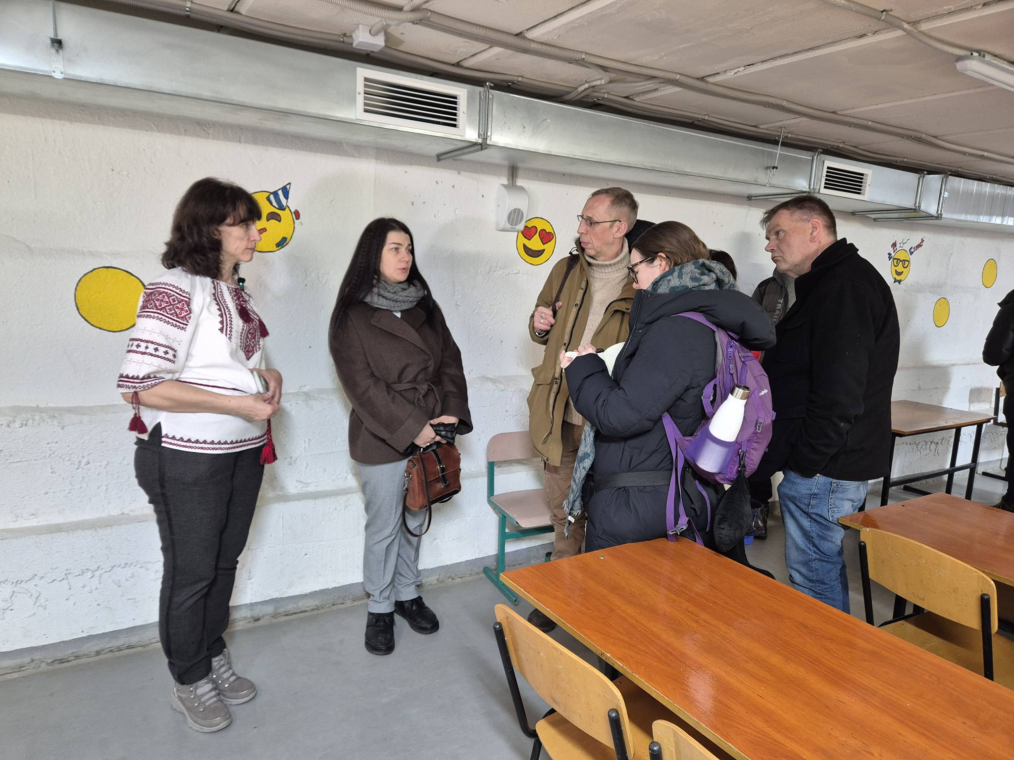 The sun comes out after the freezing night, and Kryvyi Rih is beautiful under the blue sky. Snezhana Oleksu from Social Movement takes us to the school where she teaches and where the children are studying underground due to an air raid alert. She then introduces us to her English students, aged 7-14, and we had great fun helping them practice their language skills.