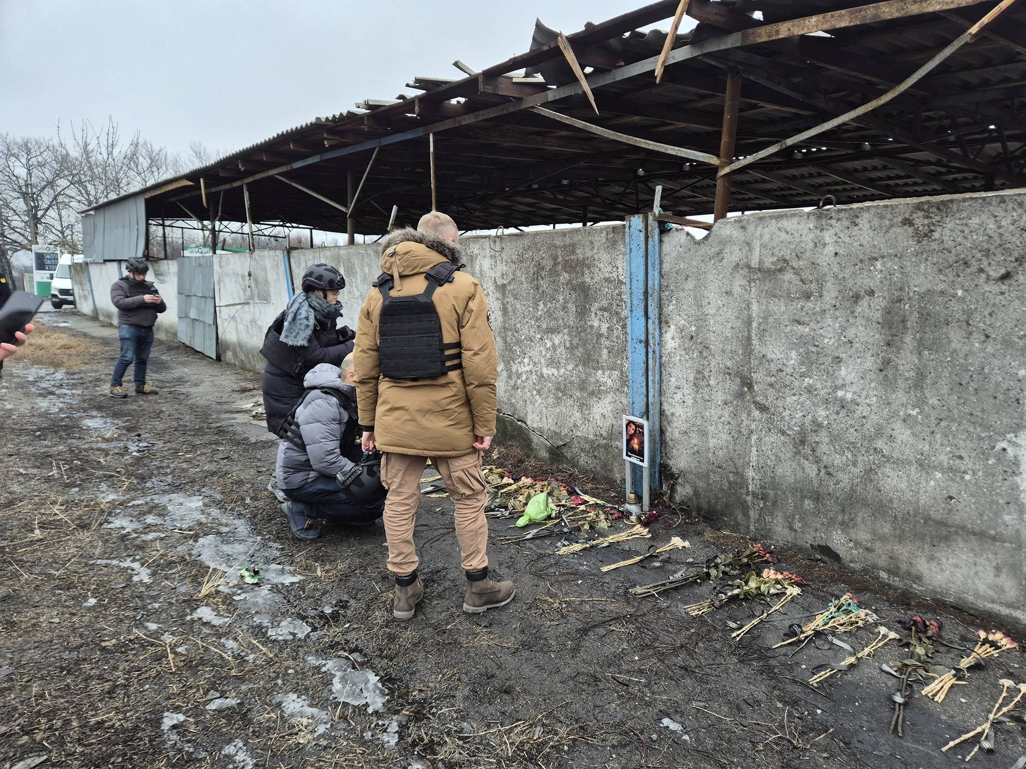 From there, we put on our helmets and kevlar vests and drove to the site where 12 people, mostly miners but one woman who worked at a nearby petrol station, were killed by a Russian drone attack. The drones hit their bus as they were leaving their shift. It was a stark reminder of the daily violence and danger that mineworkers face.