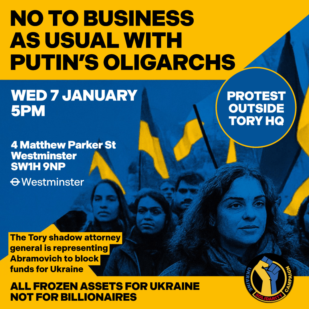 Join us at Conservative Party HQ next Wednesday, 7 January, from 5pm, to say no to the Shadow Attorney General working to protect oligarch Roman Abramovich More info: info@ukrainesolidaritycampaign.org Speakers will include: Yuliya Yurchenko, Confederation of Free Trade Unions of UkraineJoe Powell MP, Kensington and BayswaterJohn McDonnell MP, Hayes and HarlingtonJake Richards MP, Parliamentary Under-Secretary … Continue reading NO TO BUSINESS AS USUAL WITH PUTIN’S OLIGARCHS – PROTEST AT TORY HEAD OFFICE