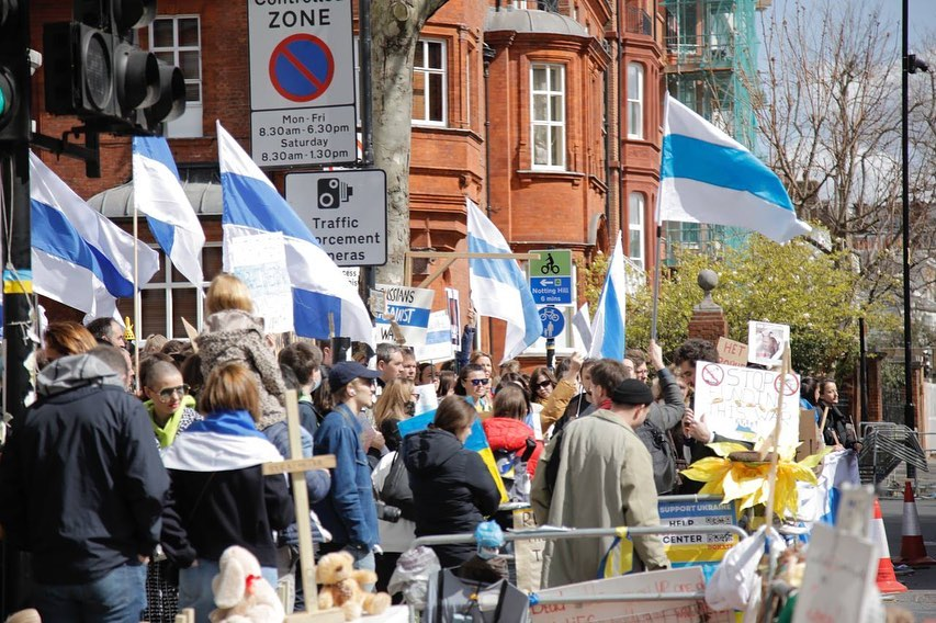 This May Day weekend Ukraine Solidarity Campaign joined with Russian Against the War in calling a protest at the Russian Embassy on Saturday 30 April. The protest united activists of the labour movement with Ukrainians, Russians, Poles, Belarussians in opposition to the Putin regime and the war on Ukraine. There were calls for freedom for … Continue reading UNITED AGAINST PUTIN -PROTEST AT RUSSIAN EMBASSY