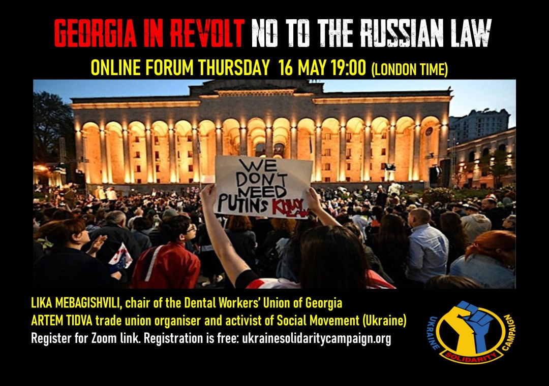 Join us for a discussion of the youth-led revolt against state authoritarianism and Russian domination in Georgia. Georgia is being rocked by huge, youth-led protests against its pro-Russian government’s attempts to crack down on non-government organisations and civil society, through a “foreign influence” law modelled on the one passed in Russia in 2012. The protesters … Continue reading No to the Russian law!” – Georgia in revolt